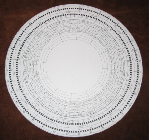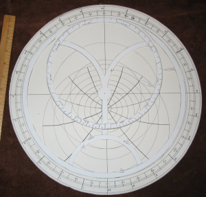 Medieval and Renaissance astrolabes could have a variety of different useful things on the back, often information that could also be presented in tabular form. Since I am interested in medieval astrology, I chose to put astrological tables on my instrument. Similar circular tables were found on some medieval instruments (Cleempoel 2002). I used tabular material from Alcabitius, a major medieval text. I intentionally left extra space to add more tables as I figure out what is most useful. Many of the lines were drawn freehand – remember, this is a student instrument, and accuracy in those places was not essential. Astronomically-important lines were drawn with a ruler.