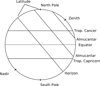 The latitude of a location is the angle between the horizon and the north pole. At the terrestrial north pole, the celestial north pole is directly overhead, so the latitude is 90º, while at the equator the celestial north pole is permanently on the horizon, and the latitude is 0º. The zenith is the point directly overhead, and the nadir is the point directly below (on the other side of the earth, and yes, medieval astronomers knew that the earth was spherical, just like everything else in the heavens). The horizon is the circle halfway between the zenith and nadir, and almucantars (from the Arabic) are lines of equal angular elevation above the horizon (for example, 10º above the horizon).