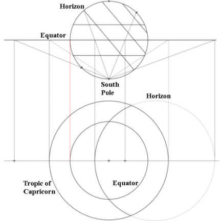 The traditional projection used for astrolabes uses the south pole as a focal point and the equator as the line onto which things are projected (Figure 2). For example, to figure out how to draw the horizon on an astrolabe, a line on the celestial sphere diagram (top of Figure 2) is drawn from each end of the horizon to the south pole. The points where these lines cross the equator mark the circumference of the horizon circle on the astrolabe (bottom of Figure 2).